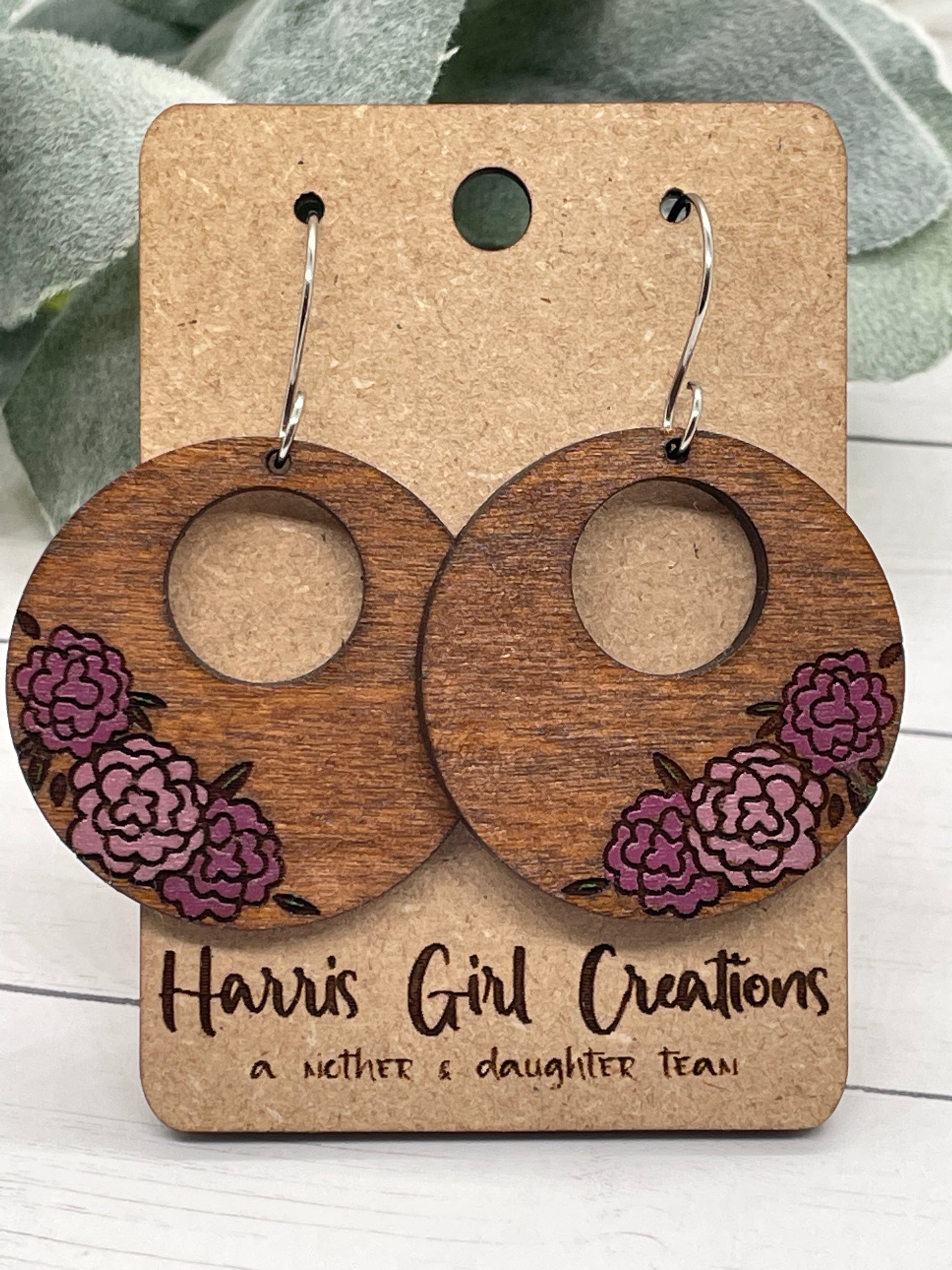 You will love these handmade and hand-painted floral hoop engraved wood earrings! Made with Sapele and hand painted for that special touch, these dangle wood circle earrings are complete with hypoallergenic stainless steel earwires for those with sensitive skin. A great way to dress up any outfit. Or buy them as a gift for a friend.