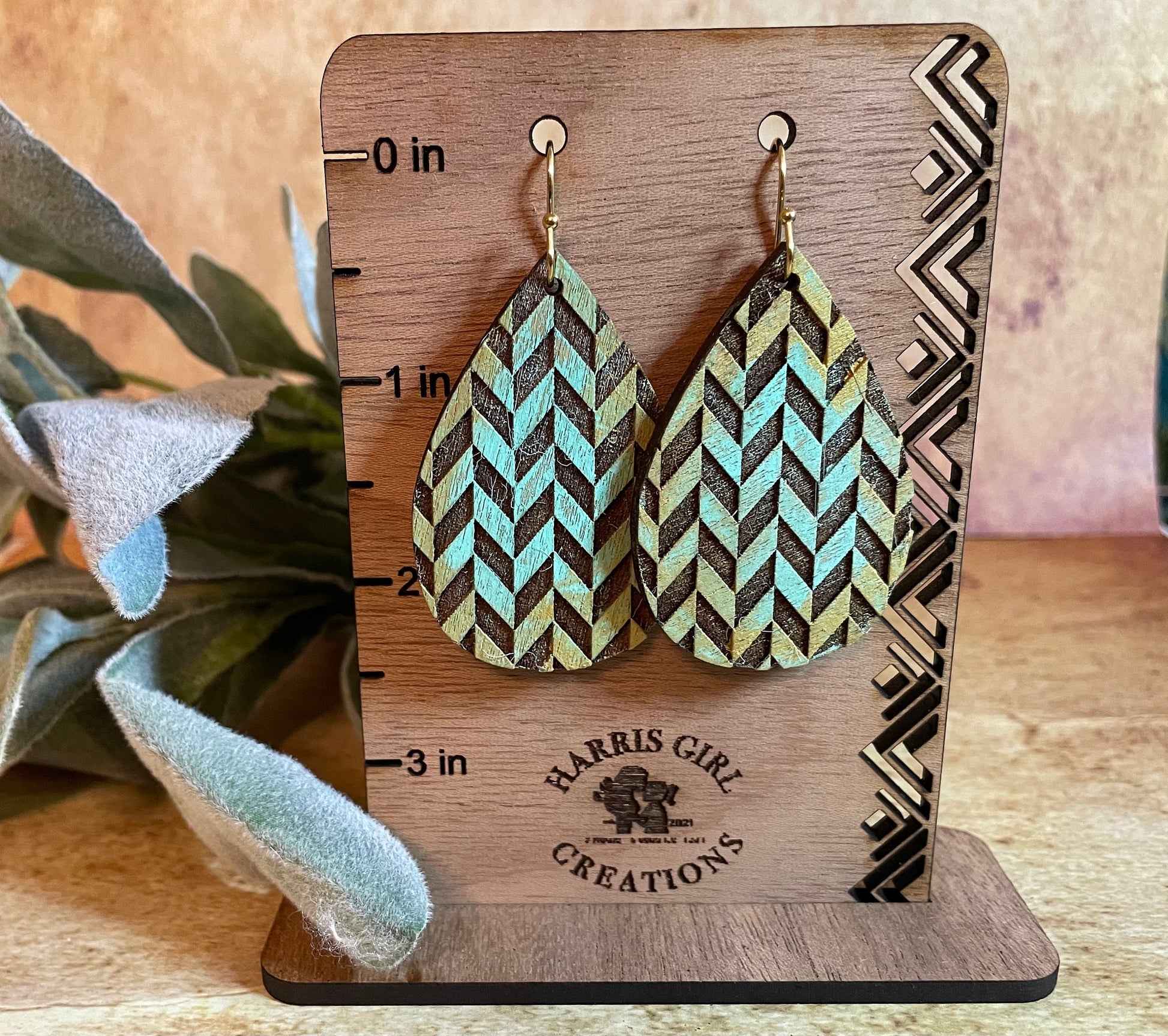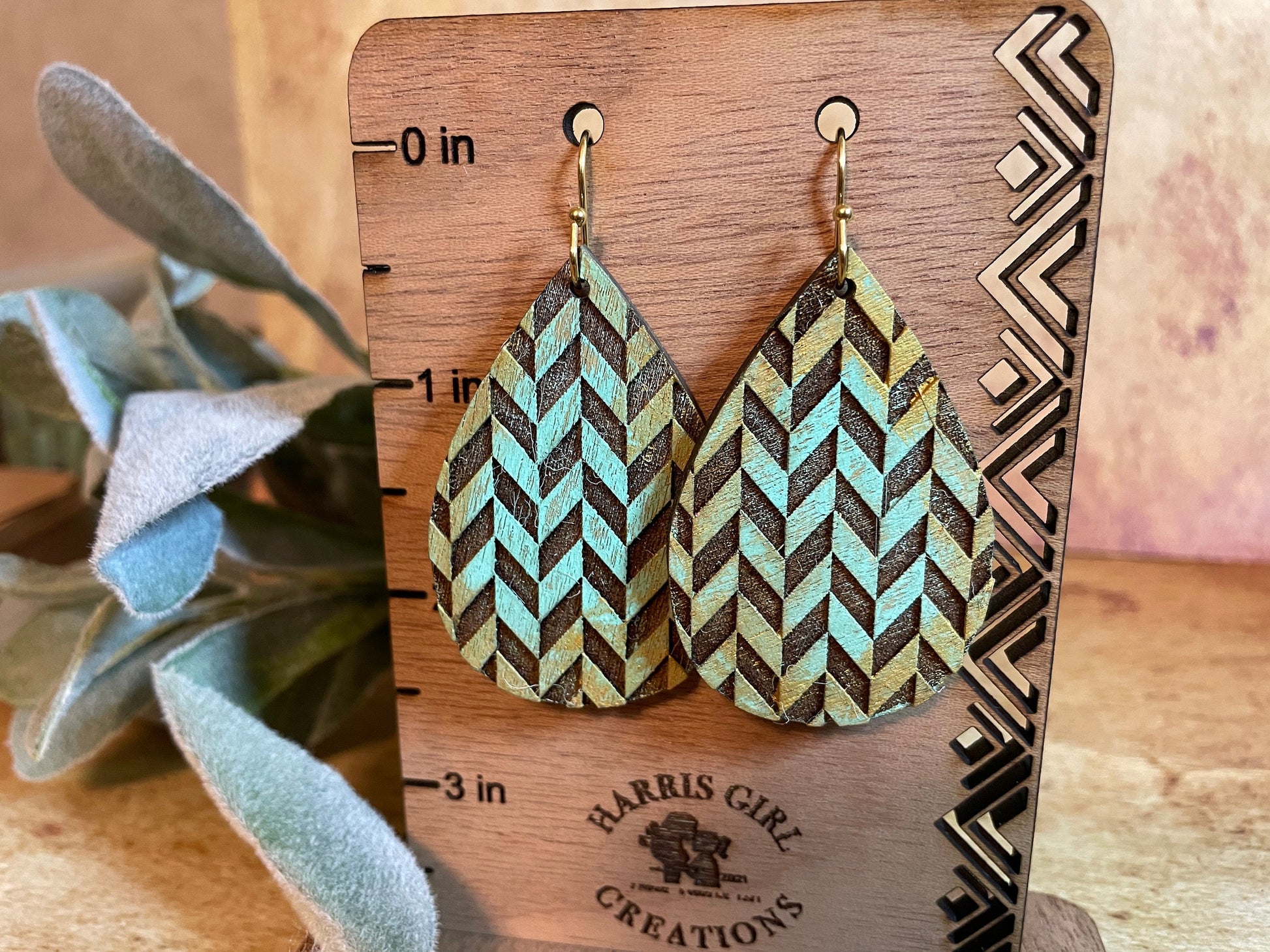 Each wooden earring is laser cut from recycled wood and then handpainted/stained by mother and/or daughter and sealed to last! The edges of the wood are a dark brown from the laser cutting process and accentuate the color of the earrings perfectly.